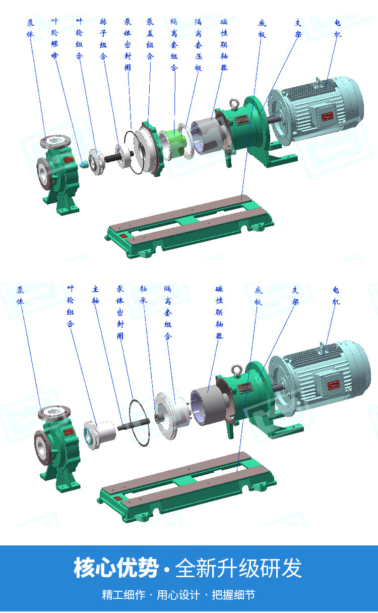 用途 IMD系列磁力泵,適用于輸送強腐蝕,易燃、易爆、有毒、易揮發(fā)的化學介質(zhì)。適用溫度:-20℃~100℃ 設計特點 1、無滴漏 IMD系列磁力驅(qū)動泵,取消了軸封,利用磁力偶合間接傳動,完全消除了滴漏的現(xiàn)象。 2、無磁渦流熱 IMD系列磁力驅(qū)動泵采用最新材料制成的隔離套具有高強度的力學性,徹底消除了一般磁力泵具有的磁渦流的現(xiàn)象。 3、易拆卸 IMD系列磁力驅(qū)動泵采用獨特的后拉式結(jié)構(gòu),一人便可以輕松地進行內(nèi)部檢修和零件更換,無需拆卸管道,大大方便了日常的檢修和保養(yǎng)工作。 4、結(jié)構(gòu)緊湊 采用直聯(lián)式結(jié)構(gòu),磁性聯(lián)軸器直接安裝于電機軸上,無滾動軸承損耗,高效率、低噪音。泵整機占用場地小,節(jié)約空間,安裝簡便。